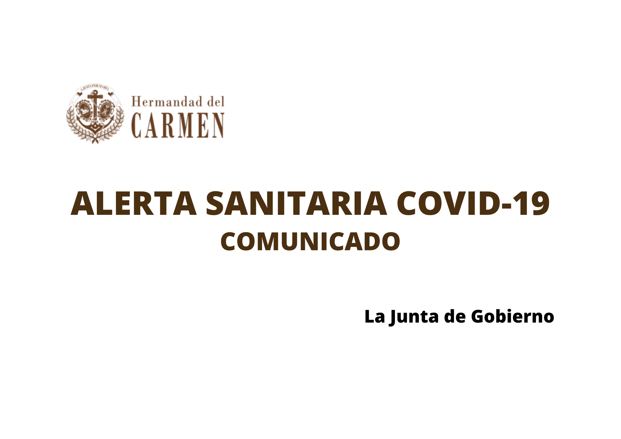 La Junta de Gobierno de la Hermandad del Carmen, reunida con carácter extraordinario para analizar la situación actual y teniendo en cuenta las recomendaciones sobre el problema de salud pública causado por la pandemia de coronavirus, así como la suspensión de la Estación de Penitencia acordada por las autoridades competentes, ha decidido: