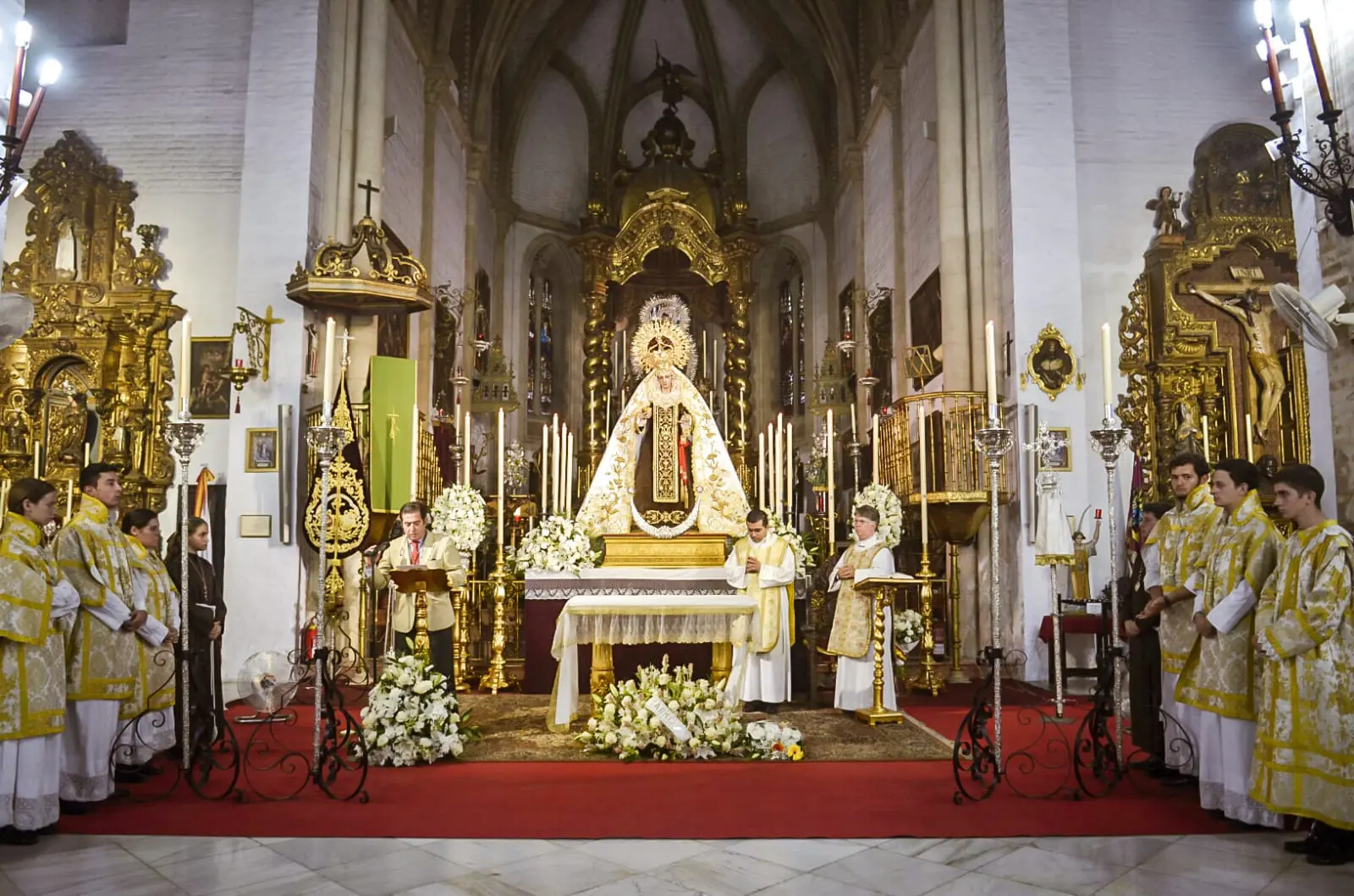 La Stma. Virgen del Carmen se encontraba en el Altar Mayor dispuesta sobre un sencillo altar adornado con centro de flores blancas variadas e iluminada por candeleros, luciendo el terno que estrenara el pasado año, compuesto de manto de tisú blanco bordado en oro por Manuel Solano y saya y escapulario marrón bordado por Jesús Rosado, portando sobre sus sienes la corona de salida que labrara Emilio Méndez y, a la cintura, el fajín del Almirante D. Antonio González-Aller.