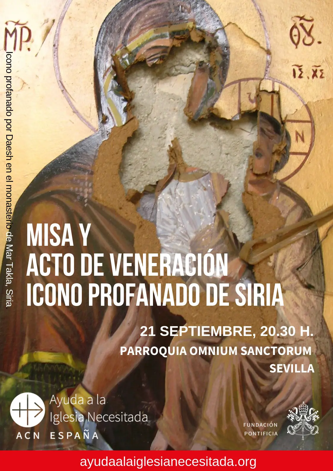 Gracias a la Fundación pontificia ACN, Ayuda a la Iglesia Necesitada, la Archidiócesis de Sevilla tendrá la oportunidad de venerar un icono mariano profanado por el Daesh. Proveniente de Siria, concretamente de una iglesia grecoortodoxa de Homs –tercera ciudad más importante del país después de Damasco y Alepo-, la tabla tiene una bala incrustada y varios impactos de otros proyectiles.