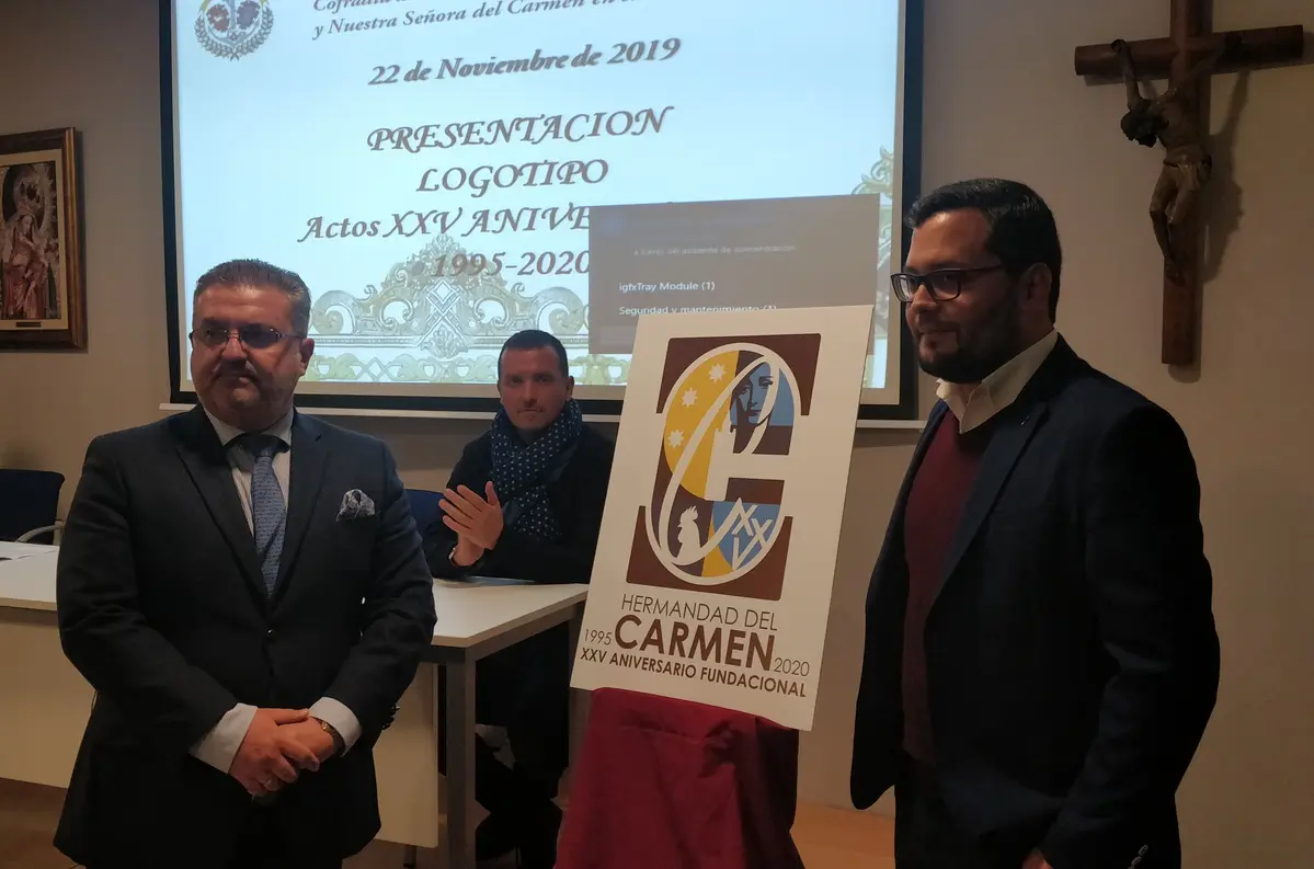 A continuación, se descubrió la obra cuyo proceso de realización fue explicado por el propio artista. En el logotipo se representa un escapulario marrón y blanco que acoge la letra «C» de «Carmen» en referencia al título de nuestra Hermandad, el rostro de la Virgen del Carmen, las estrellas en referencia a las órdenes carmelitas vinculadas, el gallo como icono del misterio de las «Negaciones de San Pedro», la torre de Omnium Sanctorum y la mención a XXV.