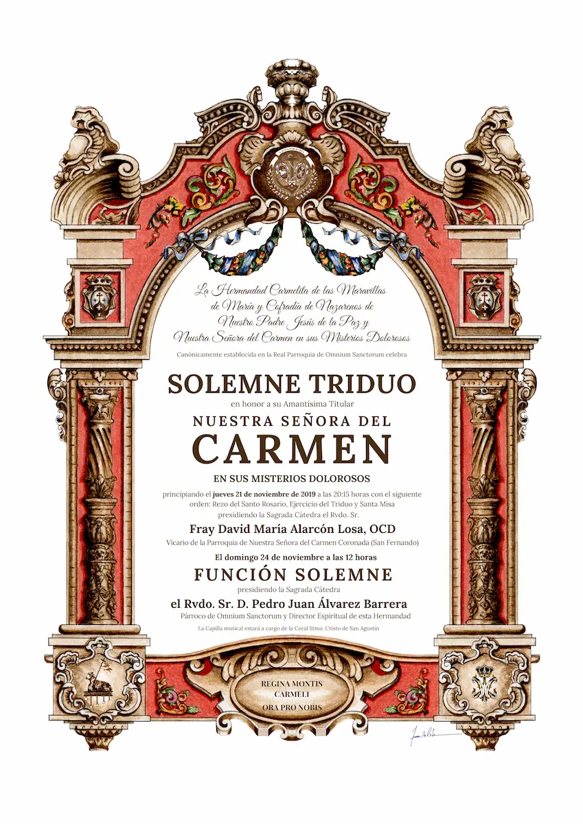 El próximo jueves día 21 de noviembre de 2019, a las ocho y cuarto de la tarde, dará comienzo el SOLEMNE TRIDUO anual que la Hermandad celebra en honor de Su Amantísima Titular NUESTRA SEÑORA DEL CARMEN EN SUS MISTERIOS DOLOROSOS ocupando la Sagrada Cátedra el Rvdo. Sr. Fray David María Alarcón Losa, OCD, Vicario parroquial de Ntra. Sra. del Carmen Coronada (San Fernando).
