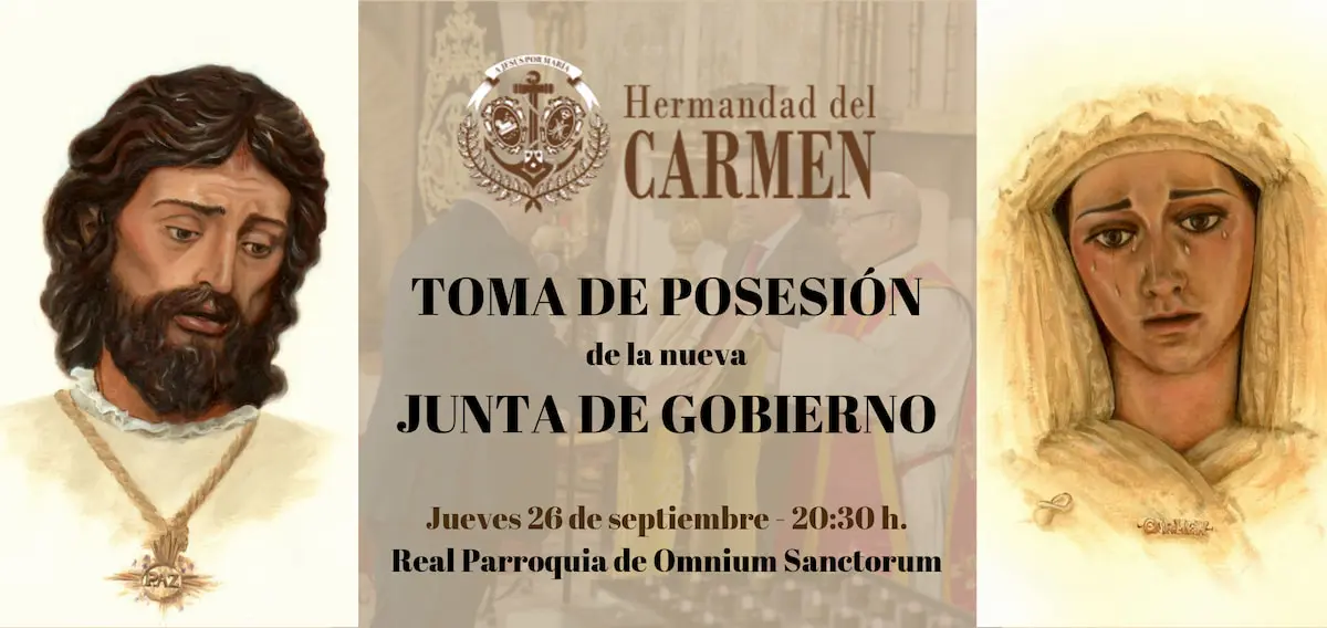 Una vez realizada la aprobación y concedida la autorización por parte de la Archidiócesis Hispalense, la nueva junta de gobierno, elegida en el Cabildo de Elecciones celebrado el pasado 18 de septiembre, presidida por NHD Manuel Luis Pazos Casado como hermano mayor tomará posesión de sus cargos el próximo jueves 26 de septiembre a las 20:30 horas, hecho que tendrá lugar durante el transcurso de la misa de Espíritu Santo que se celebrará en la Real Parroquia de Omnium Sanctorum.